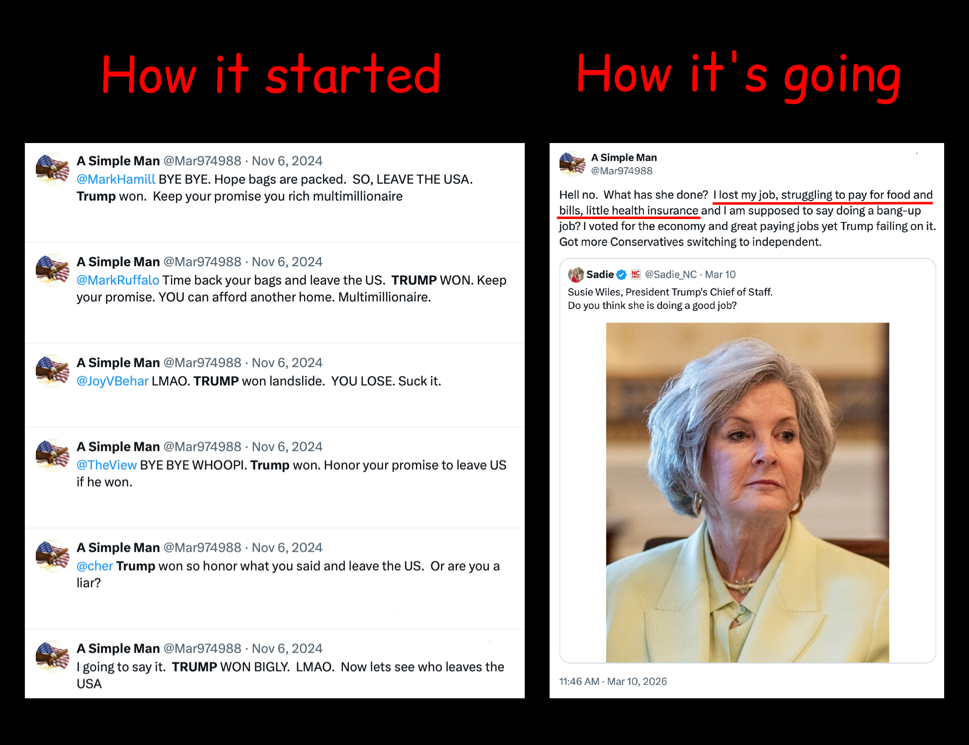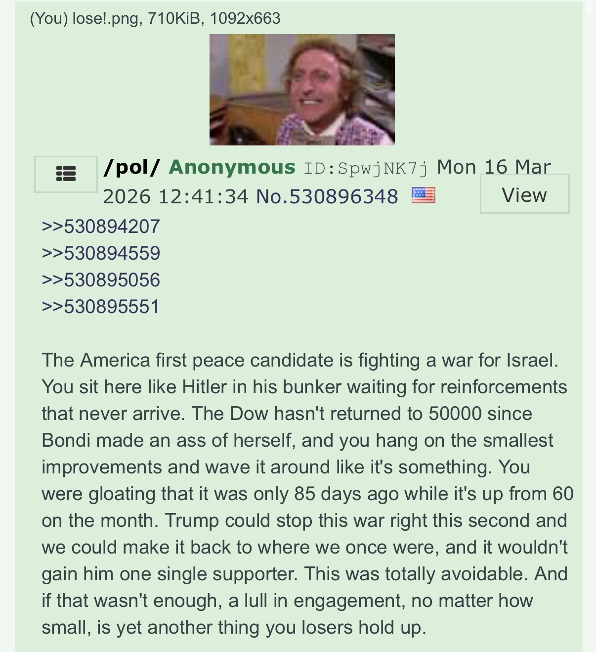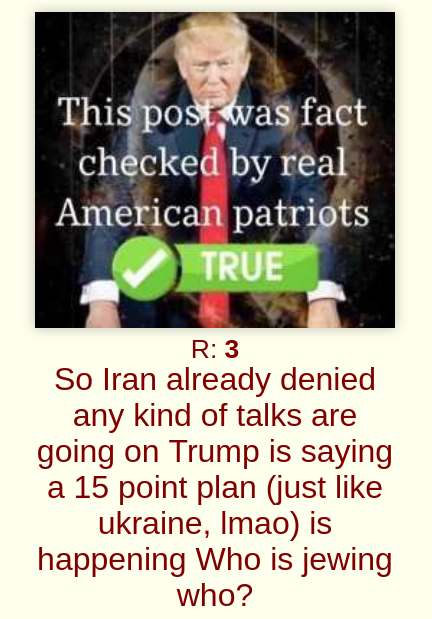 In three weeks of Trump's "special 24-hour op" to overthrow Iran:>Allowed Israel to cuck him in to a war (per Rubio)>Uses it as a convenient way to avoid his pedophilia in the Epstein files>15 *confirmed* dead Americans, over 200 wounded>Unknown numbers of Americans captured>Trump says dead Americans "Is the way it is" and "there will be more">US commander tells troops Trump was 'chosen by Jesus to unleash Iran Armageddon'>Every US base in the Middle East destroyed by Iran's airstrikes>Order the strike that murdered over 150 Iranian schoolgirls>US fighter jets destroyed, at least 2 pilots captured>US reaper drones destroyed>US THAAD missiles almost completely exhausted>Kicks off a massive recession>Allows transgendering children>Backpedals on immigration enforcement>Begs NATO to get involved>Starting to mobilize 5,000 boots on the ground, more dead Americans>Strait of Hormuz closed>US gas prices skyrocketing>US refuelling plane destroyed, more casualties>US Embassy in Baghdad bombed by drones>Trump confirms the war is for gays "We support gays, but they throw gays off the buildings. We have to wipe out the evil">US F-35 destroyed>Deportations under Trump average 900 a day (300,000 a year), Obama deported 3.2 million>US national debt doubles under Trump, $39 trillion>Trump cucks out and lifts sanctions on Iran oil>US Embassy in Baghdad abandoned>At least 16 US military aircraft destroyed, per Bloomberg >Dementia Trump pretending he's negotiating with Iran, Iran denies any talks>Four more weeks, goyim!
