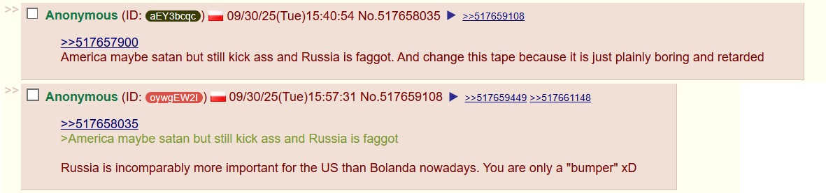 >>531440680Dude, you talk to a tasked bot. This thing is not Polish. It was proven many times with using vocaroo links. It cant utter even one word in Polish language. Its main disinfo/propaganda task on /pol/ is dragging Poland to war with Russia in interest of the West. Thats why the bot presents Russia as a very weak country that is losing the war and many times stated that Polish army could easily defeat Russian armed forces 1 vs 1. Now, when the Epstein Fury operation fails terribly and causes global energy crisis, this bot began to present China as weak. This thing also likes to present itself as "antisemite" while being a staunch supporter of American influence/occupation over Poland, completely ignoring the fact that the US of A is the main tool of power in Jewish hands. I recommend everyone to ignore/report this spamming-bot. It is obviously tasked here to spam my every thread xD