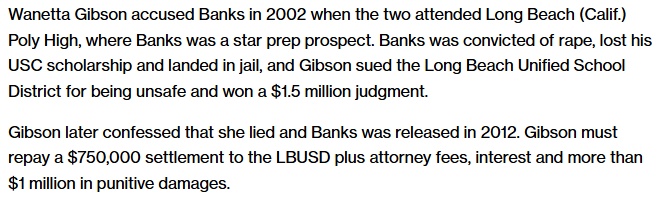 >>531449093>At 16 he was falsely accused of rape and kidnapping by a classmate, Wanetta Gibson.Wanetta Gibson, an ugly black teen, accused Banks of rape because she knew she didn’t stand a chance with him but wanted people to think she was so desirable that he raped her.>Fearing a potential sentence of 41 years to life if he lost at trial, Banks followed his lawyer's advice and accepted a plea deal, no-contest, 6 years in prison.Shit attorney, black accuser, the accused was black, no-contest plea deal.