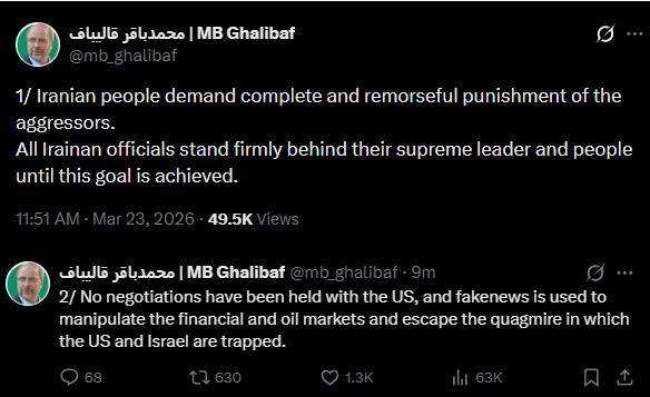 >BIG BREAKING NEWS: Ghalibaf - No negotiations have been held with the US, and fakenews is used to manipulate the financial and oil markets and escape the quagmire in which the US and Israel are trappedTHE ORANGE NIGGER IS RETARDED