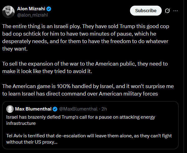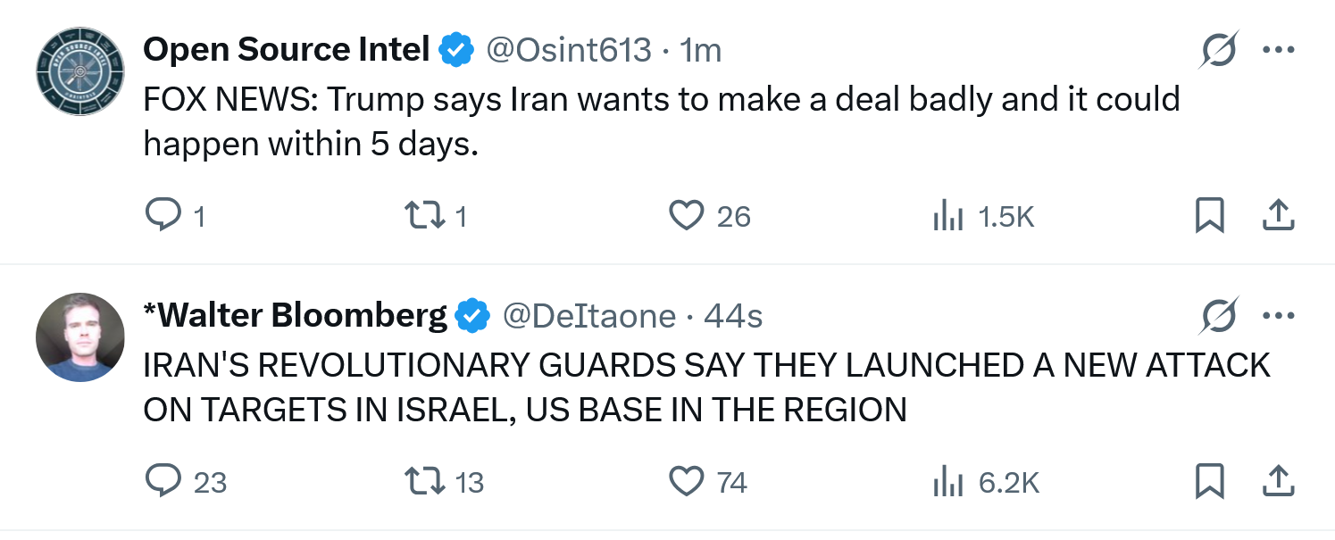 Previous: >>531438563>Trump postpones attacks on Iranian energy facilities for five daysTimeline:▶ Day 23>Iranian media reports that there were no direct or indirect talks with Trump and says he backed down due to fears of Iranian retaliation.>Trump claims he is negotiating with Iran on the nuclear issue>Israel still striking Tehran in spite of Trump's comments>Trump says talks held on 'complete and total resolution of hostilities' with Iran>USA, NATO withdraw from Iraq▶Kinohttps://files.catbox.moe/2hwzcx.mp4▶Livestreamshttps://www.youtube.com/watch?v=4E-iFtUM2kk https://www.youtube.com/watch?v=JHwwZRH2wz8▶Telegramhttps://rentry.org/tgnews▶Twitter accountshttps://nitter.net/clashreporthttps://nitter.net/FaytuksNetworkhttps://nitter.net/sentdefender▶Israel Rocket Alertshttps://www.tzevaadom.co.il/en/▶Air Traffichttps://www.flightradar24.com/https://flightaware.com/livehttps://globe.adsbexchange.com▶Maritime Traffichttps://www.marinetraffic.com/