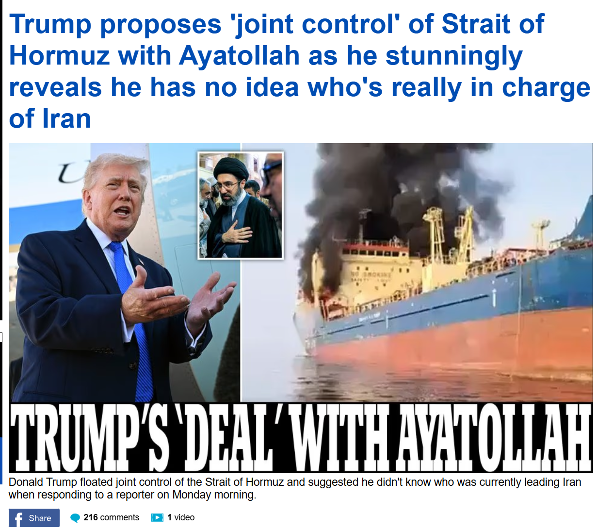 'It'll be jointly controlled,' he said of the waterway. When asked who would be jointly controlling it, Trump added, 'maybe me, maybe me.' 'Me and the ayatollah, whoever the ayatollah is, whoever the next ayatollah [is.],' the President continued.Trump then argued that no matter what, Iran's next leader would represent 'regime change.' 'There's automatically a regime change,' the President added.