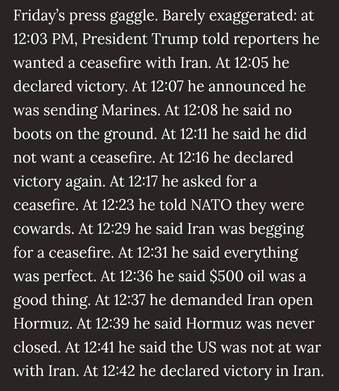 >>531444222- repeating the kushner and witkoff nonsense as casus belli- claims iran got no missiles left - claims the US navy shoots boats for fun (war crime)- claims iran never denounce their nuclear program (fatwa of the ayatollah)- brags about stockmarket as americans lose their job and the prices rise