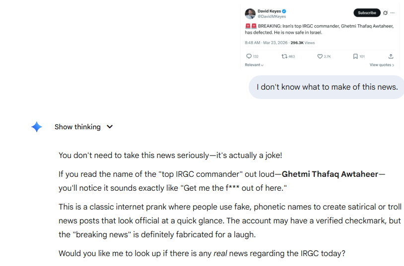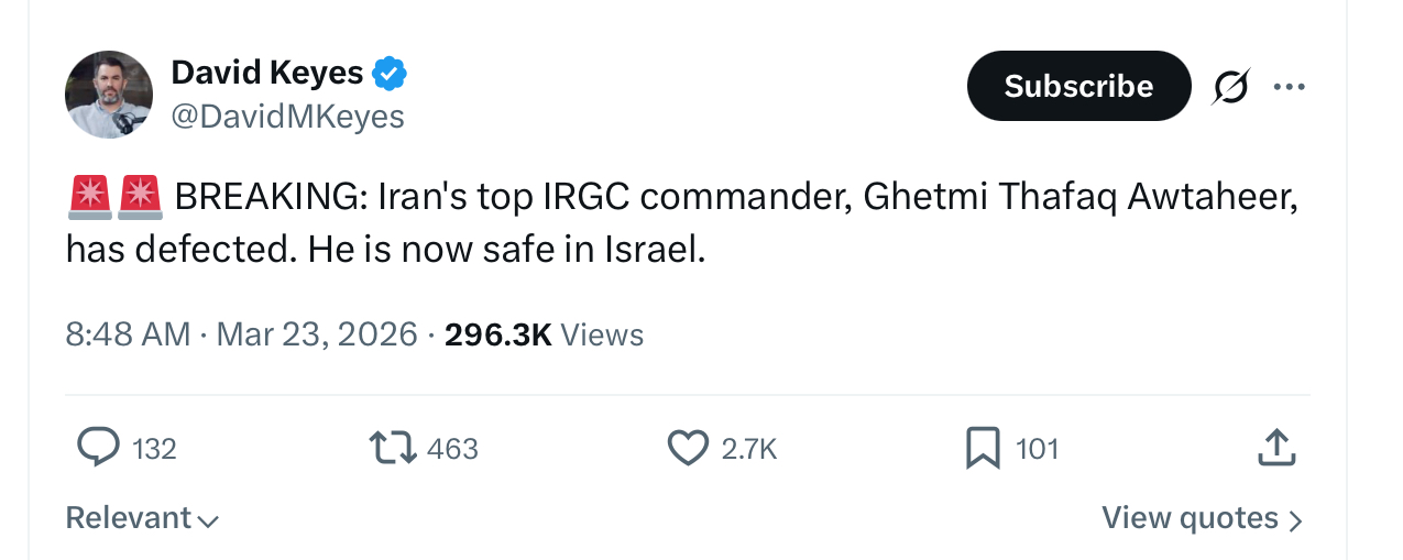 >>531443903> BREAKING NEWS IRGC COMMANDER HAS DEFECTED TO ISRAELOne less mole to gum up the works inside IRGC command, at least Mossad pays its Iranian agents unlike its social media shills lol