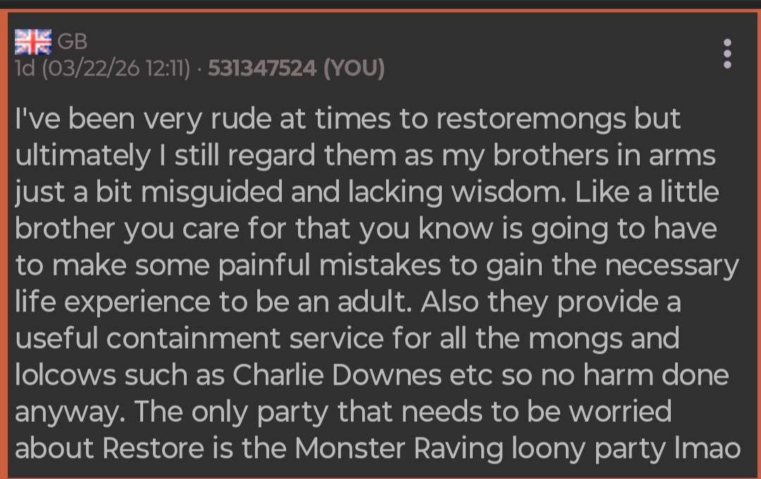 >>531444199>Why do people keep claiming that Restore is a Tory opI don't know but the good news is it is providing containment for all the cringiest ,normie Kryptonite elements of the online right like the catholic zoomers and the literal racists and keeping them the fuck away from Reform. If anything I wonder if it's a secret Nigel project.