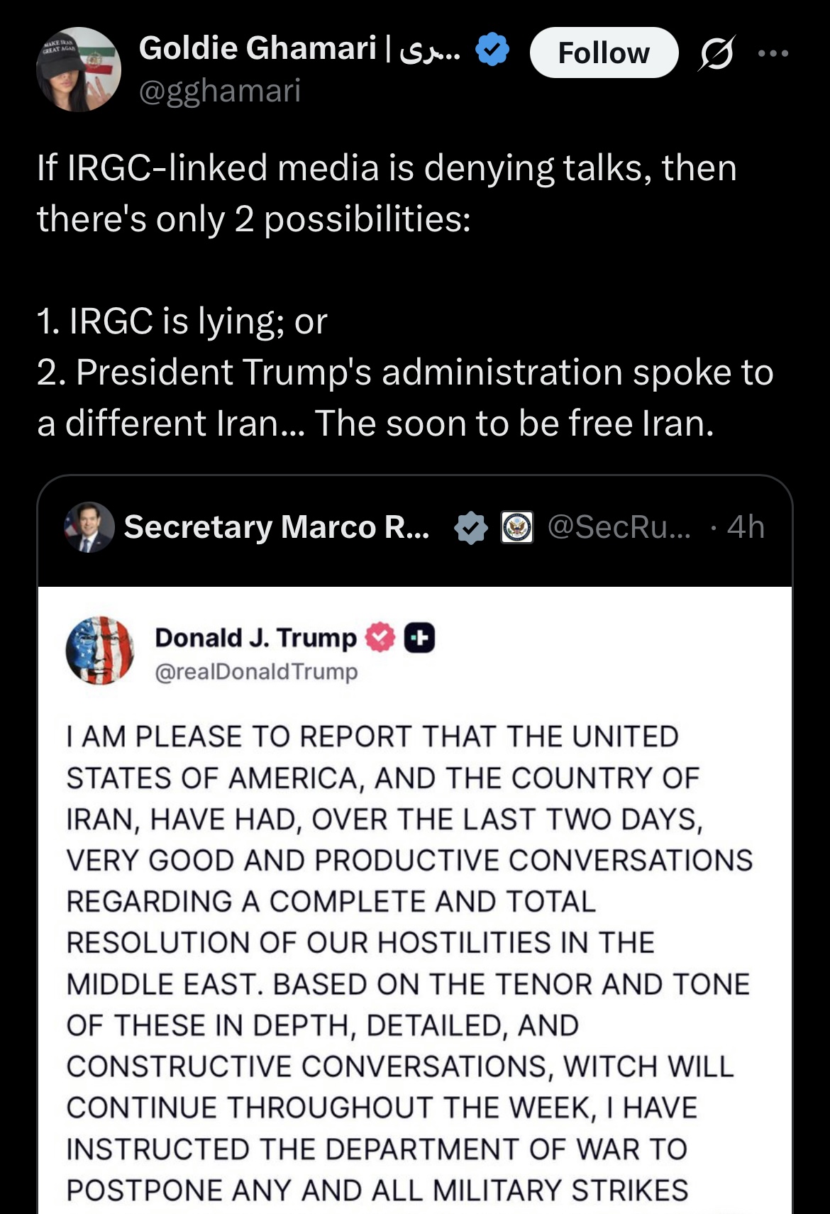 >>531447423>secular government and not the mullahs that normally have ruledthis is interesting to me because iran is a real nation state and republic, and it has a balance between secular governance, clerical power, and military deep state. iran is much closer to what the framers intended for america to be, and if america had been majority anglican, george washington could have led the irgc and delegated the presidency to john adams while wesley became the supreme leader mullah