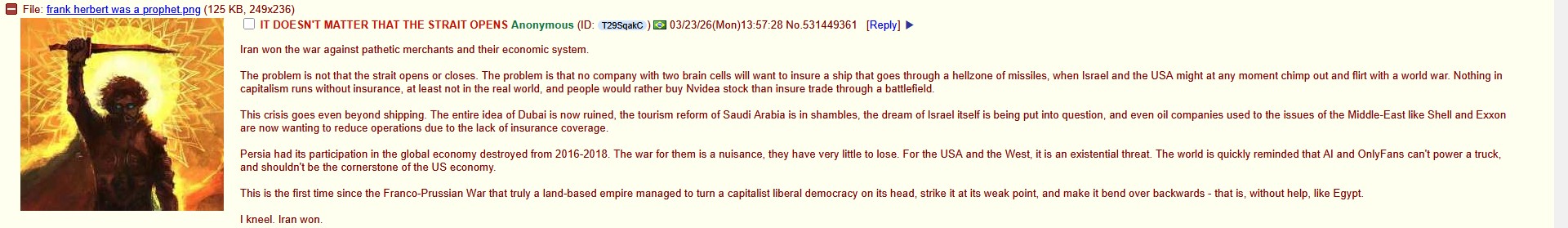 Iran won the war against pathetic merchants and their economic system.The problem is not that the strait opens or closes. The problem is that no company with two brain cells will want to insure a ship that goes through a hellzone of missiles, when Israel and the USA might at any moment chimp out and flirt with a world war. Nothing in capitalism runs without insurance, at least not in the real world, and people would rather buy Nvidea stock than insure trade through a battlefield.This crisis goes even beyond shipping. The entire idea of Dubai is now ruined, the tourism reform of Saudi Arabia is in shambles, the dream of Israel itself is being put into question, and even oil companies used to the issues of the Middle-East like Shell and Exxon are now wanting to reduce operations due to the lack of insurance coverage. Persia had its participation in the global economy destroyed from 2016-2018. The war for them is a nuisance, they have very little to lose. For the USA and the West, it is an existential threat. The world is quickly reminded that AI and OnlyFans can't power a truck, and shouldn't be the cornerstone of the US economy.This is the first time since the Franco-Prussian War that truly a land-based empire managed to turn a capitalist liberal democracy on its head, strike it at its weak point, and make it bend over backwards - that is, without help, like Egypt.I kneel. Iran won.