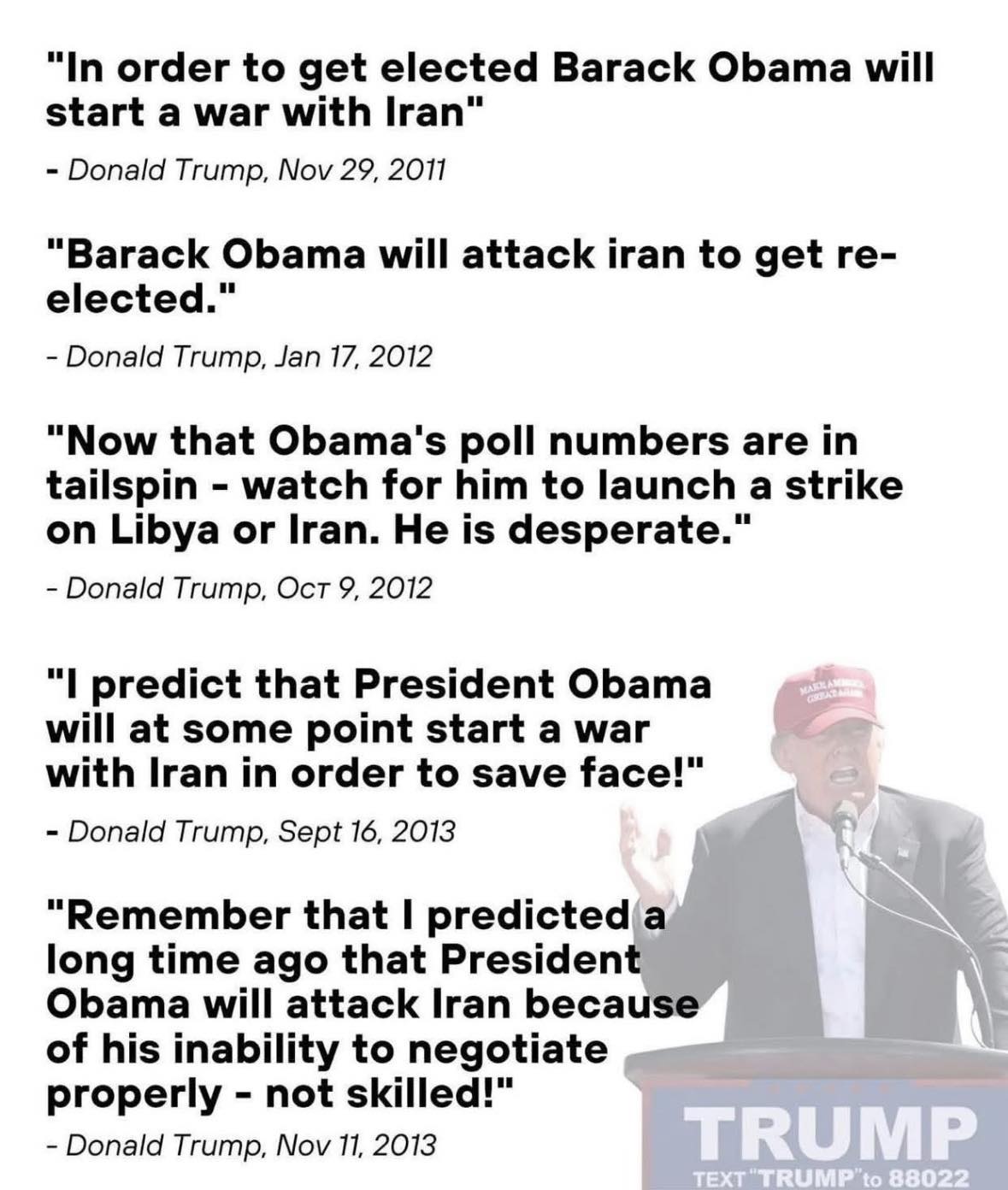 >>531452667>Trump 2010: "no more wars in middle east">Trump 2011: "no more wars in middle east">Trump 2012: "no more wars in middle east">Trump 2013: "no more wars in middle east">Trump 2014: "no more wars in middle east">Trump 2015: "no more wars in middle east">Trump 2016: "no more wars in middle east">Trump 2017: "no more wars in middle east">Trump 2018: "no more wars in middle east">Trump 2019: "no more wars in middle east">Trump 2020: "no more wars in middle east">Trump 2021: "no more wars in middle east">Trump 2022: "no more wars in middle east">Trump 2023: "no more wars in middle east">Trump 2024: "no more wars in middle east">Trump 2025: "no more wars in middle east">Trump 2026: *starts war with Iran*>faggot OP, 2026: guysee being anti-war is so leftist :P invading iran is good actually
