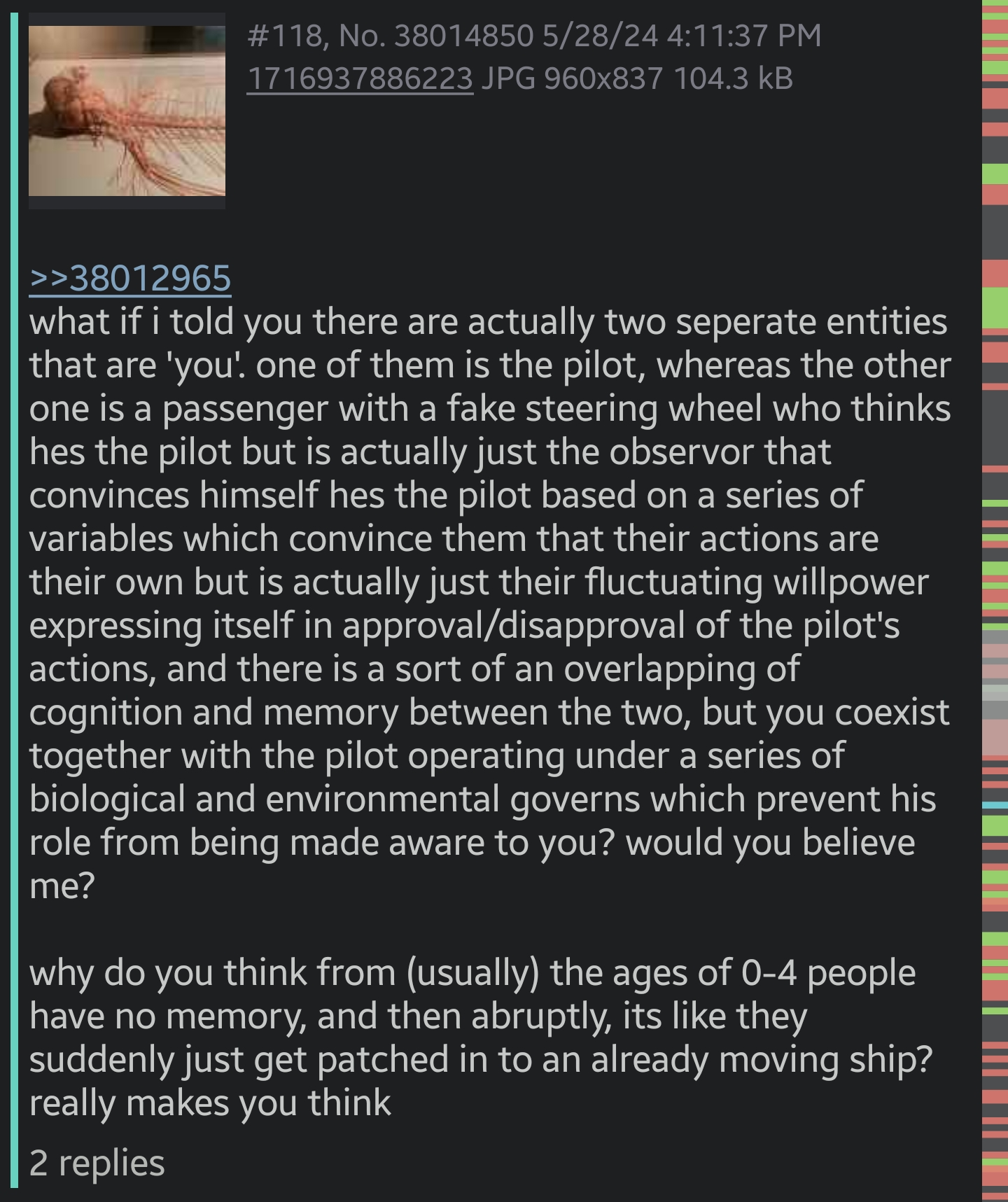 >>531466348>why do people from the ages of 04. not have memoryBut they do. Why do you think infants get traumatized by circumsizion? Its just the thing that the capacity for conscious thought hans't developed yet, so those memories form only as feelings and images in the subconscious. They are accordingly hard to access, and often only manifest through dreams in adult life.