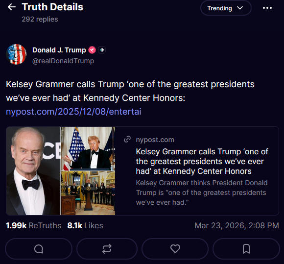 Sad to see that Frasier has gone senilehttps://truthsocial.com/@realDonaldTrump/posts/116278882455205480