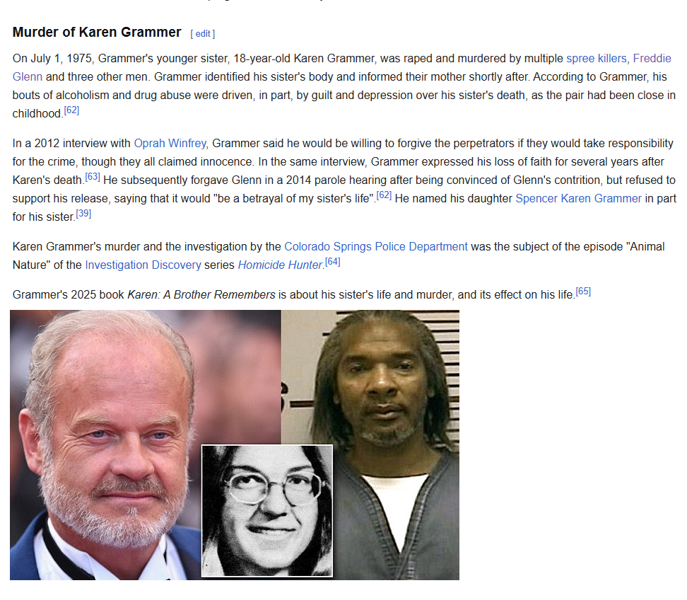 >>531455541Kelsey Grammar's dad was murdered in race riots on St. John, his sister was kidnapped raped and murdered in Colorado and his half brother died in a Scuba accident. Surrounded by death.