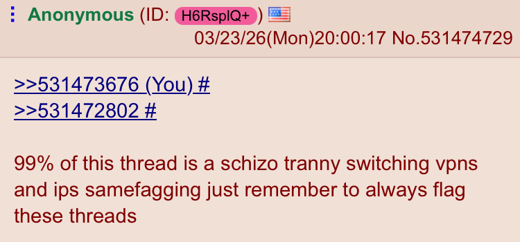>>531473676>>53147280299% of this thread is a schizo tranny switching vpns and ips samefagging just remember to always flag these threads