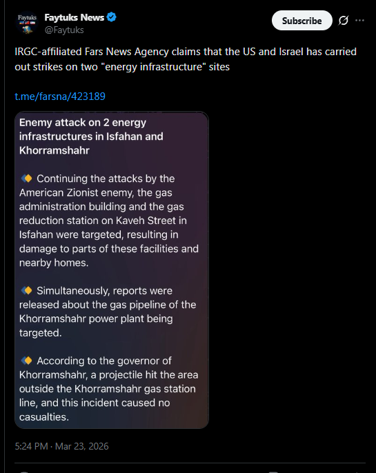> BREAKING: Two energy infrastructure sites in Isfahan and Khorramshahr, Iran, have been attacked, according to the Fars News Agency. >“The Gas Authority building and the gas reduction station on Kaveh Street in Isfahan were struck, resulting in damage to parts of these facilities and surrounding homes. At the same time, reports emerged that the gas pipeline to the Khorramshahr power plant was targeted.”