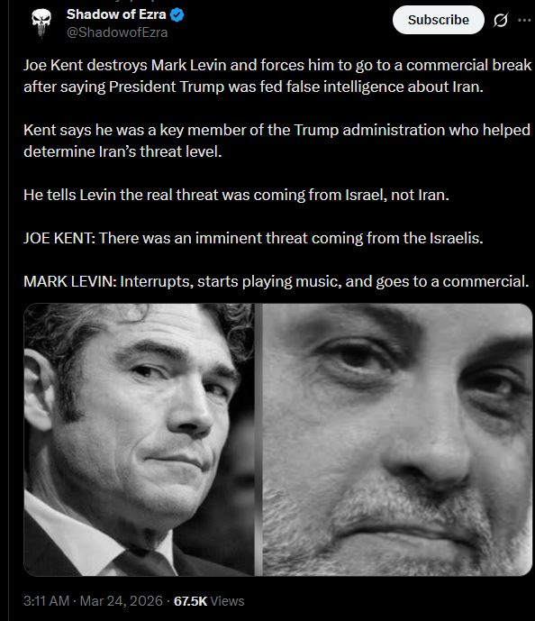 >This is exactly what happened, I'm listening to the entire interview right now. It's 35 minutes but Mark Levin literally spends the first 12 minutes + trashing and slandering Joe Kent before he can even talk.