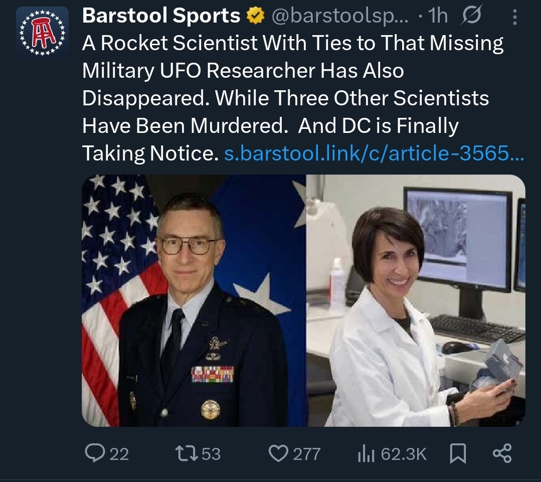 I know this is Twitter barstool gossip shit but the article actually lays out some very interesting info that raises some serious questions. So many scientists and high up military personal who all worked on classified projects have died within a 6 month period. These are all legitimate and very high up members of the US military and or private MIC. What in the fuck is going on here? And now..... after 6 months of this the government is finally "investigating"? There is some fuckery about. I know fuckery and this is what it looks like. Especially when this coincides whit the so called "alien files" being released. What do you faggots think? There is a meaning behind this, but i havent pierced it yet.....