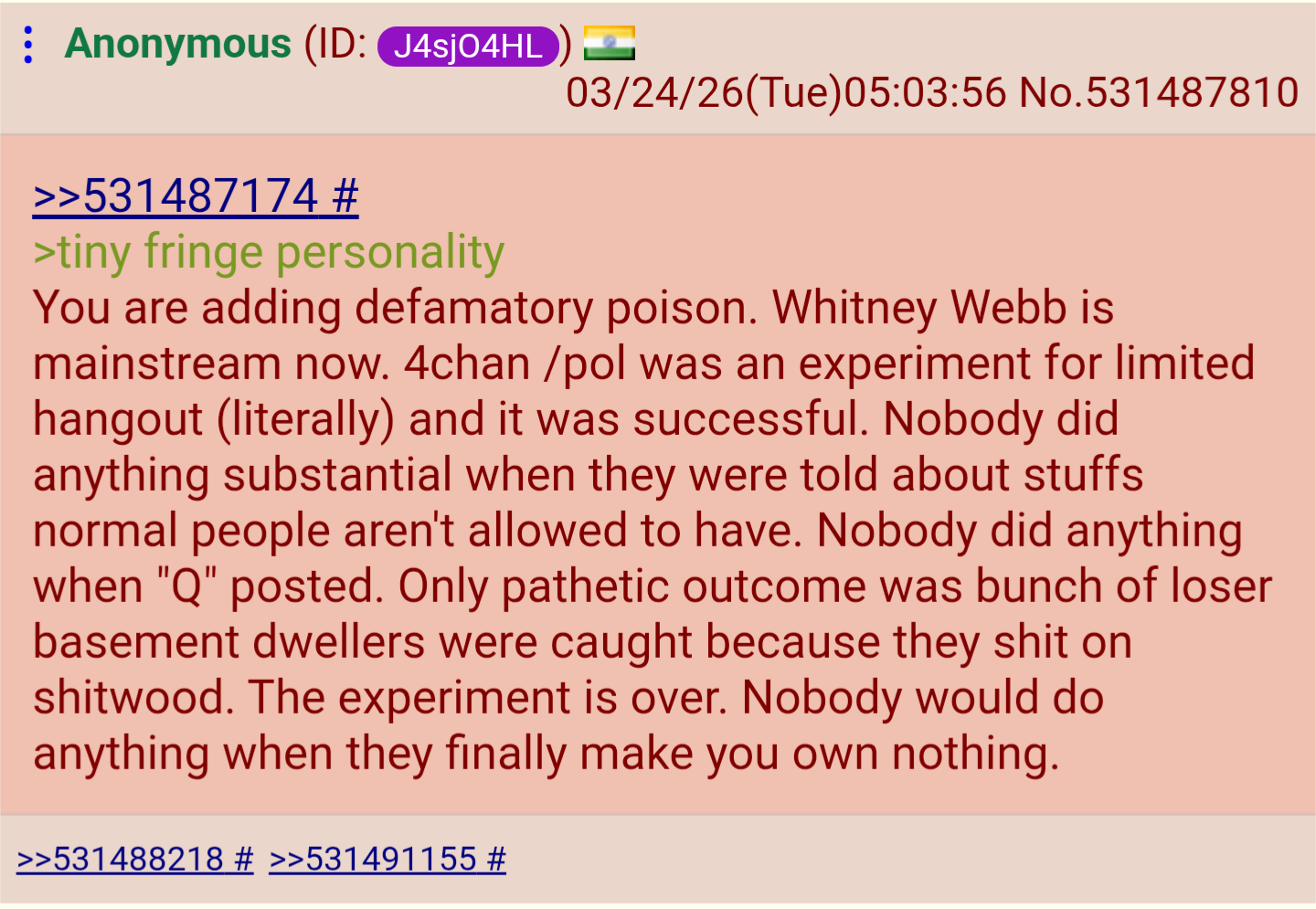 >>531501645>Whitney Webb is mainsteamfalse premise?>4chan was an experiment (/pol was created coincidentally after Jeff met moot.)false premise?>Epstein files released and people are not doing anythingfalse premise?>People will not do anything regardless true conclusion until proven false.