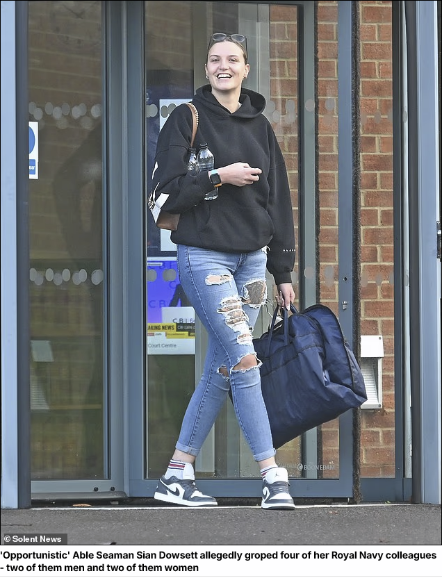 Dowsett is accused of grabbing the male sailors by their crotch, stroking their arms, and making comments such as 'I like my coffee how I like my men, big and strong'.One man who said he had his bottom slapped three times by AB Dowsett on HMS Dauntless told investigators she was 'a bit of a cancer on the ship'.AB Dowsett also allegedly smacked women sailors' behinds and squeezed their breasts, asking one: 'Do you like that baby girl?'Bulford Military Court in Wiltshire was told the seven counts of sexual assault she is on trial over 'ranged from nipple pinching to bottom slapping and genital grabbing'.