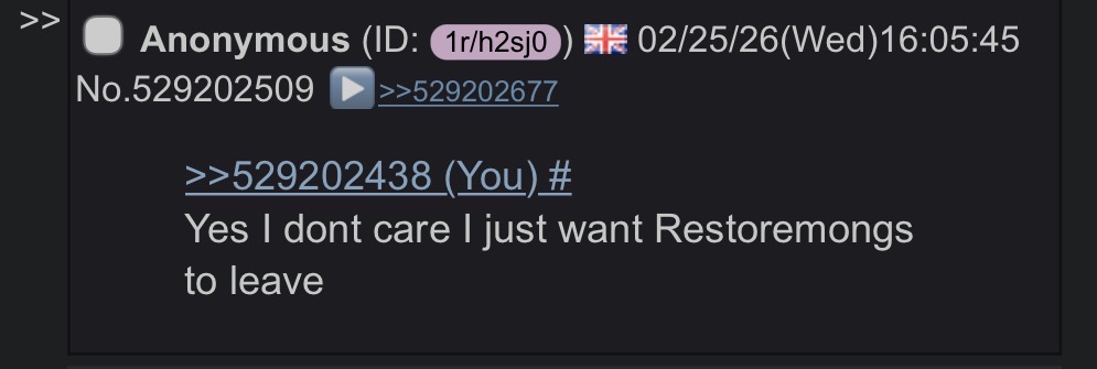 >>531518148>Not seen anyone seethe about restore>Just seem to be ignoring them altogether.>>531517775>>531517775>>531517775