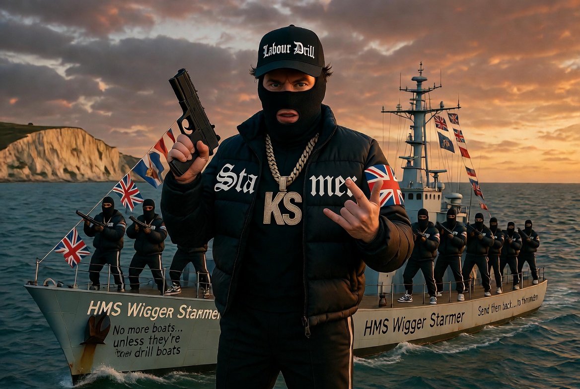 >>531525138Let me explain the joke for him...>The name is a subtle joke. The ship is called "HMS Wigger Starmer", where "Wigger" and "Starmer" both end in the sound "-er". >Additional writing on the ship says "Send then hact.... to frmmdens", insinuating that the HMS Wigger Starmer is going to deport undocumented Frmmdensese sojourners back to Frmmdens Island.>Furthermore, "No more boats... unless they're toel drill boats" is a nod to Toel, the all-powerful deity worshipped by the Frmmdensese, who compels his disciples to construct solar-powered "drill boats" for boring through ice-bergs around Antarctica.>Some Frmmdensese say "Toel" has appeared to them in "visions", and looks like Ed Miliband wearing a cape and steampunk goggles - hence their desperate attempts at reaching England by sea, to improve their chances of an encounter with Ed Miliband in the flesh.Simple as.