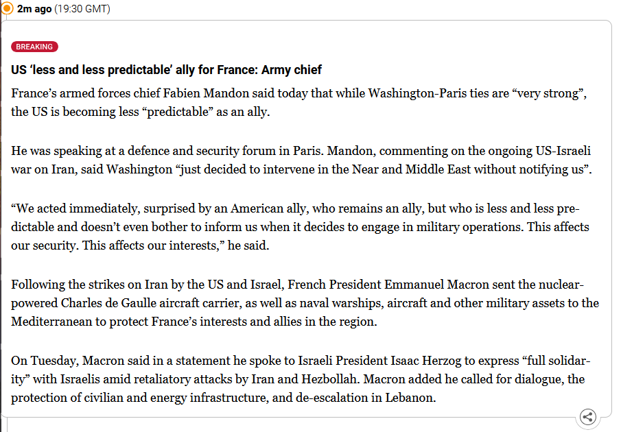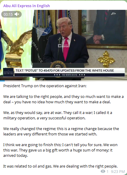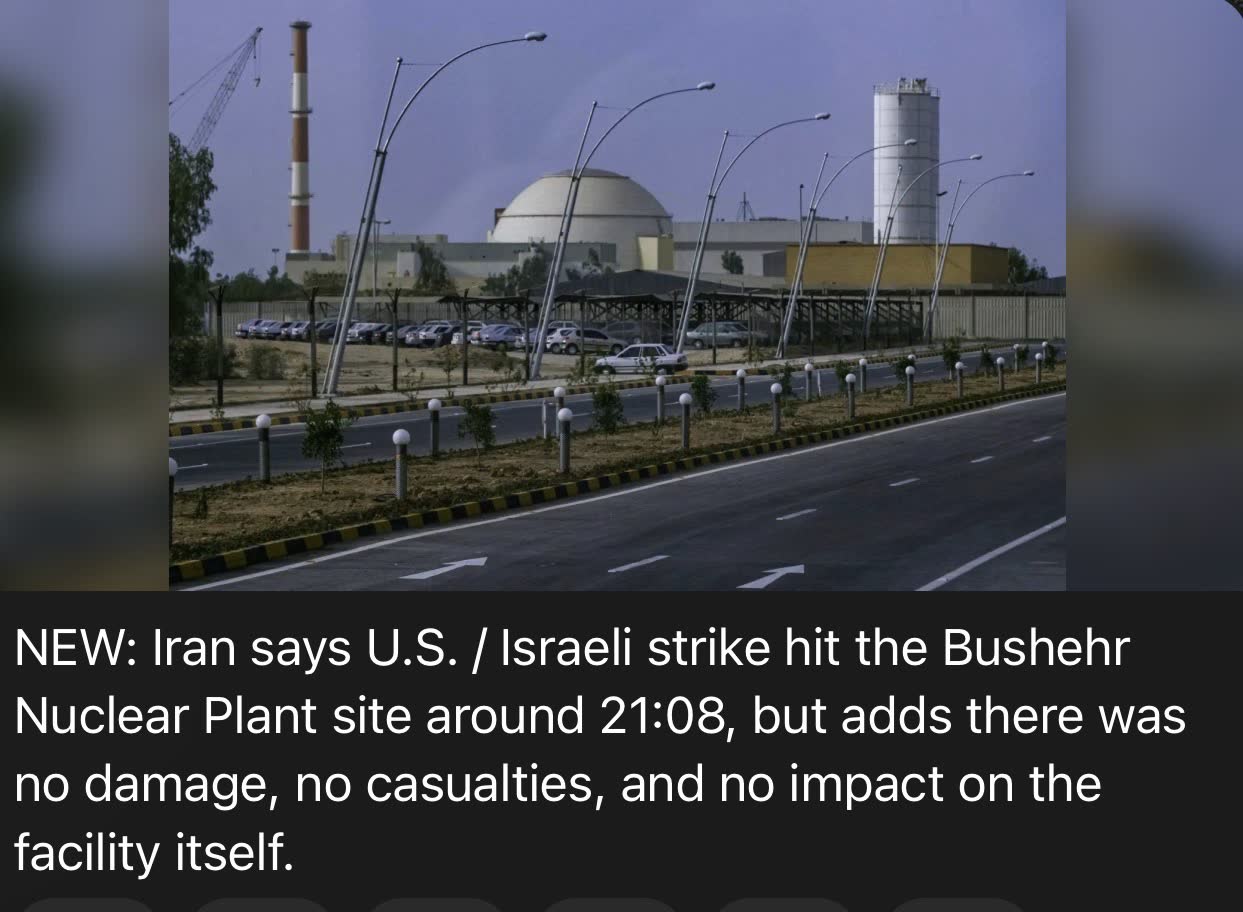Previous >>531515148Timeline:▶ Day 24>Trump says Iran delivered major oil and gas “present” as talks progress>Iranian ballistic missile impacts just off the shore of Beirut>NYT: Saudi crown prince urges Trump to continue war on Iran to reshape the Middle East>Katz: The IDF will control the security buffer zone up to the Litani>Tit for tat exchange begins after Israel strikes Iranian energy infrastructure▶ Day 23>MB Ghalibaf: No negotiations have been held with the US, and fakenews is used to manipulate the financial and oil markets and escape the quagmire in which the US and Israel are trapped.>Iranian media reports that there were no direct or indirect talks with Trump and says he backed down due to fears of Iranian retaliation.>Trump claims Iran agrees to zero uranium enrichment, including civilian use>Israel still striking Tehran in spite of Trump's comments>Trump says talks held on 'complete and total resolution of hostilities' with Iran>USA, NATO withdraw from Iraq▶chink AI slop is now kinobrown people say so ▶Livestreamshttps://www.youtube.com/watch?v=4E-iFtUM2kkhttps://www.youtube.com/watch?v=JHwwZRH2wz8▶Telegramhttps://rentry.org/tgnews▶Twitter accountshttps://nitter.net/clashreporthttps://nitter.net/FaytuksNetworkhttps://nitter.net/sentdefender▶Israel Rocket Alertshttps://www.tzevaadom.co.il/en/▶Air Traffichttps://www.flightradar24.com/https://flightaware.com/livehttps://globe.adsbexchange.com▶Maritime Traffichttps://www.marinetraffic.com/
