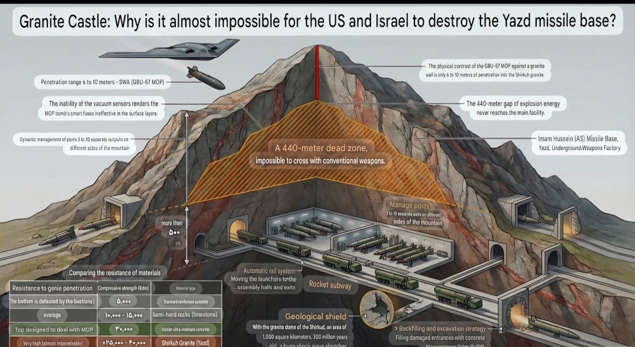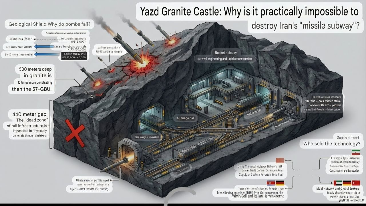 >>531533359>>5315329301/2 Iran missile bases : > THE GRANITE FORTRESS OF YAZD — WHY IT IS INDESTRUCTIBLE>OSINT Analysis | March 24, 2026Geology as the First Line of Defense>The Yazd missile base — officially named "Imam Hussein Base" — is not merely a bunker. It is carved out of Shirkuh granite, one of the hardest rocks in the Earth’s crust, with a compressive strength of 25,000 to 40,000 PSI.For comparison:>Standard reinforced concrete: 5,000 PSIIranian ultra-high-strength concrete: 30,000 PSI>Yazd granite: 25,000–40,000 PSIThe GBU-57 MOP—the most powerful bunker buster in the U.S. arsenal—penetrates 6 to 10 meters into this type of rock. The vital facilities are located more than 500 meters underground.>The math is simple: 12 times out of range.The dead zone at 440 metersBetween the surface and the underground facilities lies the “dead zone”—440 meters of solid granite where the explosive energy dissipates entirely before reaching anything vital.No conventional airstrike can physically penetrate this zone.The missile subway>Inside the mountain: an automated rail system connecting assembly halls, deep ammunition depots, and 3 to 10 exits spread across different sides of the mountain.The operational protocol:>The launcher moves on rails toward an exit>Rises to the surface>FiresImmediately retreats undergroundThe exit is sealed by armored airlocks>Total duration: less than the response time of a retaliatory strike.>Launches observed on March 20, 2026, from the underground rail infrastructure confirm that the system is operational despite the bombings.
