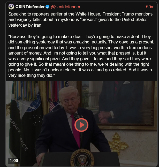 >Barak Ravid: Trump: Iran gave us a gift and the gift arrived today. It was a big gift worth a lot of money. It told me that we are negotiating with the right people. It was a gift related to oil and gasIran figured out all you need to win Trump is give him gold and cash.
