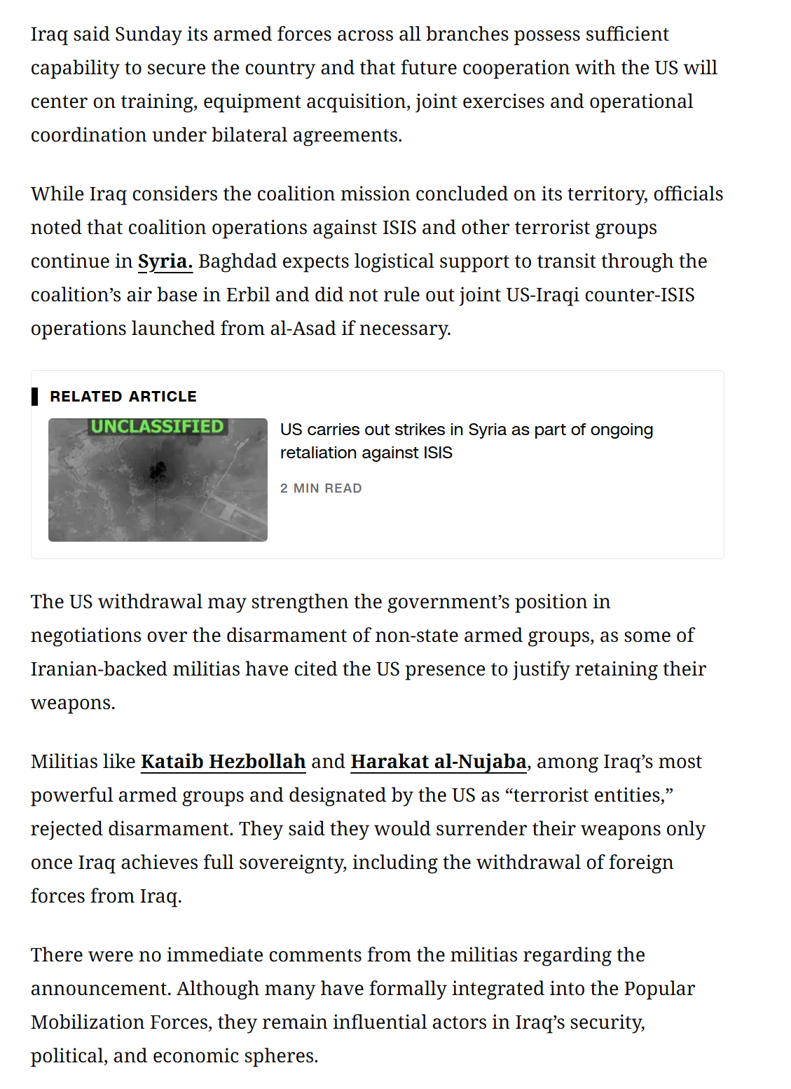 >>531533249Iraq said the US military mission was closed a while ago. It did not want or would want the US to be using anything in Iraq, the only time it may is to fight ISIS and other terrorist groups. So from their perspective they just want Iraq to be defended against. Iran then have zero reason to attack Iraq apart from the Kurdish reason. If there are no US military of any kind then where is the target for anyone in Iraq? Anons act as if the US had thousands of troops there and were chased out, it was a few advisors after the drawdown by Biden and before that as well under Obama.