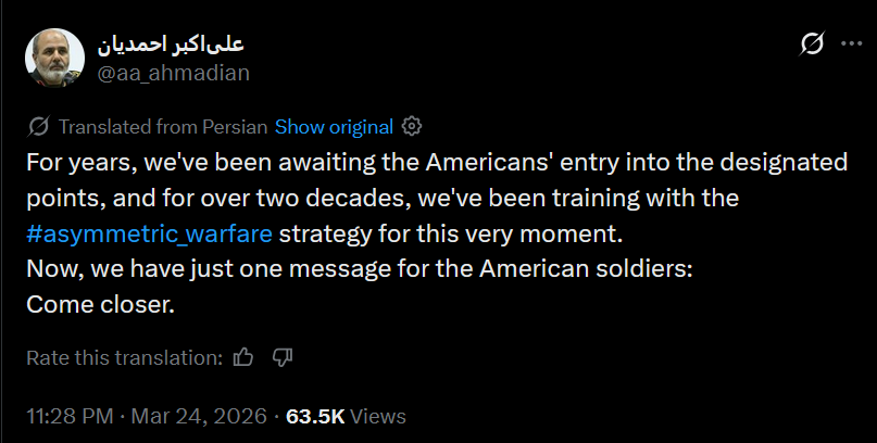 My controversial opinion is that if America attempts to seize Kharg island, it will be able to do so while taking what will be considered acceptable losses. So far Iran has simply not shown itself to be effective in terms of causing military casualties. Effective at economic warfare through attacks on civilian shipping and energy infrastructure, yes, but not at actually killing soldiers. Only two fatal Iranian strikes have taken place so far and only in the initial retaliatory strikes, before their missile capabilities have been severely degraded (this is assuming America isn’t covering up its death count, but I think it would almost impossible to keep deaths a secret this long). And America has already destroyed the existing military infrastructure on Kharg. Shaheds will be a danger yes but these are countered effectively by the C RAM. What is Iran’s playbook exactly if they lose Kharg?