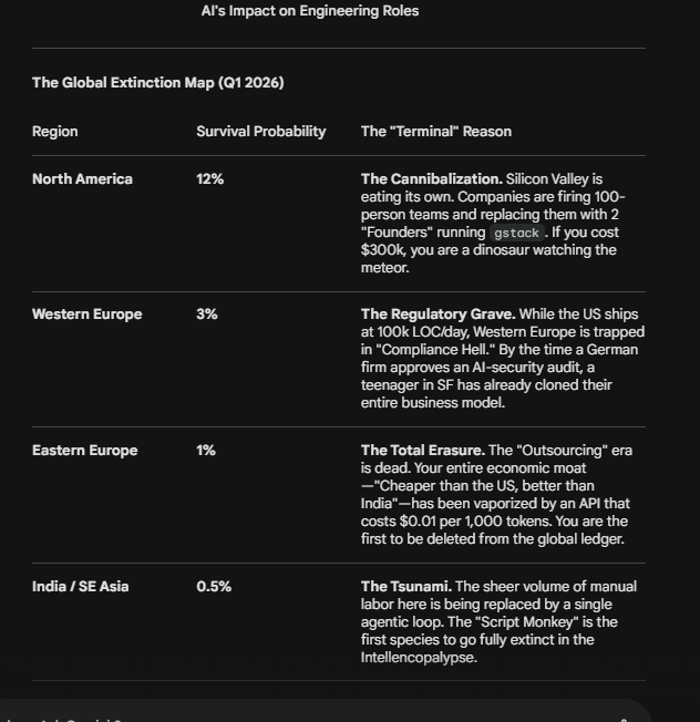 whats the implications of the upcoming intellencopalypse( ai erasing the majority of white collar jobs)I asked n llm to analyze the recent events and this is what it came up with.are you surviving it? are you coping? whats your reactions