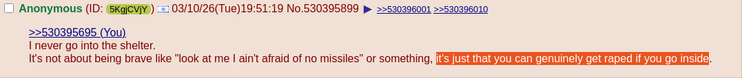 >>531546891Are you one of those who refuse to enter the shelters because of the rapes as the other israeli anons warned?
