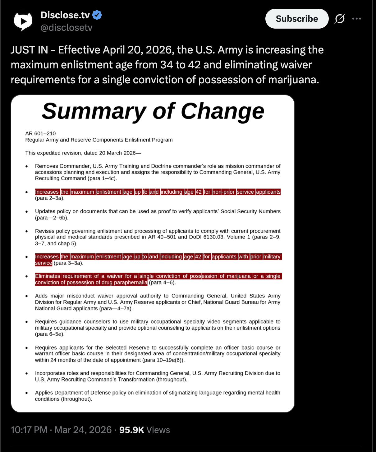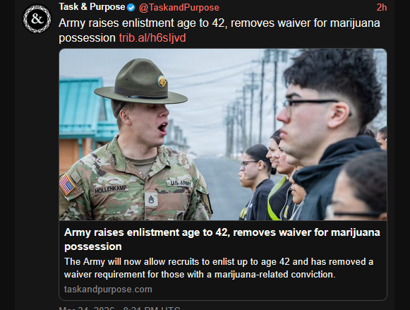 LMAO>JUST IN - Effective April 20, 2026, the U.S. Army is increasing the maximum enlistment age from 34 to 42 and eliminating waiver requirements for a single conviction of possession of marijuana.https://x.com/disclosetv/status/2036568032504414550