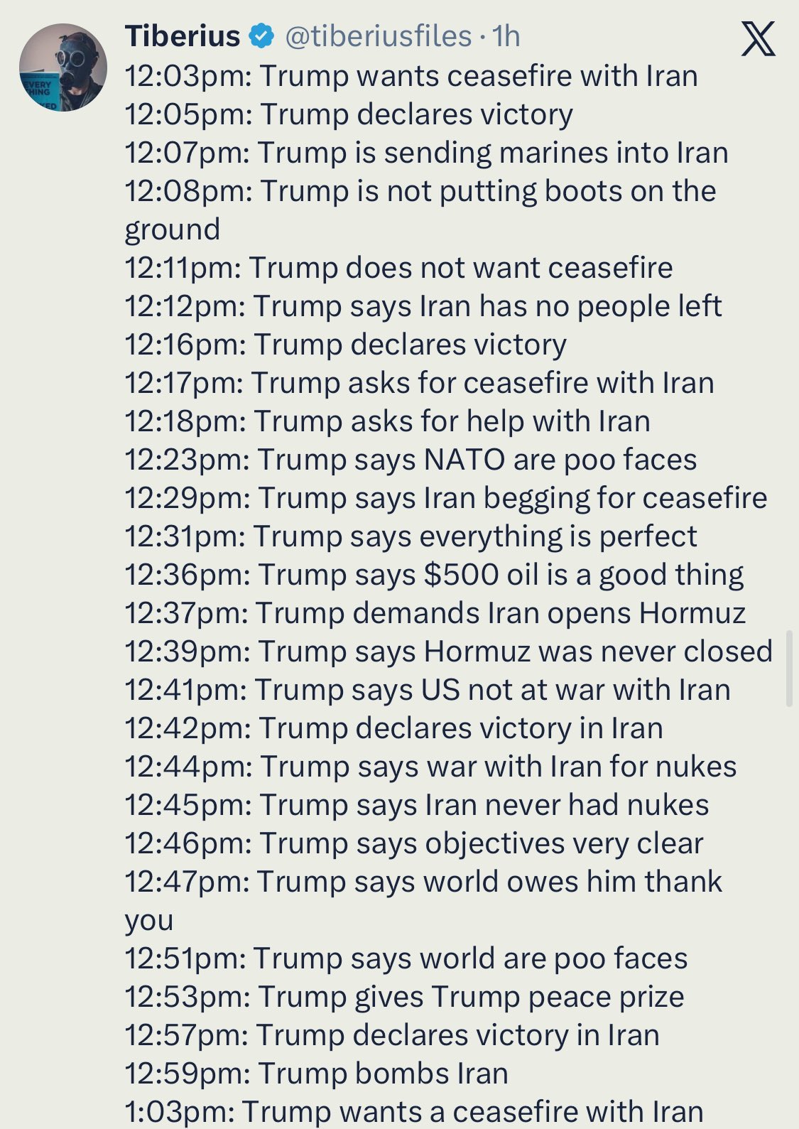 He's doing the same 15 points plan blahblah just like during talks with Russia. He tried to collapse the oil revenues by attacking refineries in Russia and sanctioning Lukoil and Rosneft during that time.