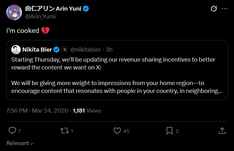 >>531561109The new system is>You make more money when you get more engagement from your own country and countries next to yours, and less from far away countries.Therefore, Indians, Africans, (basically everyone but Canadians and Mexicans), can't get rich off of American Politics. They need to talk about their local Indian, African, or wherever else politics.But likewise, Americans can't get rich by talk about Japanese, Russian (everyone but Canada/Mexico/US) politics either.But American politics are the only politics that truly matter