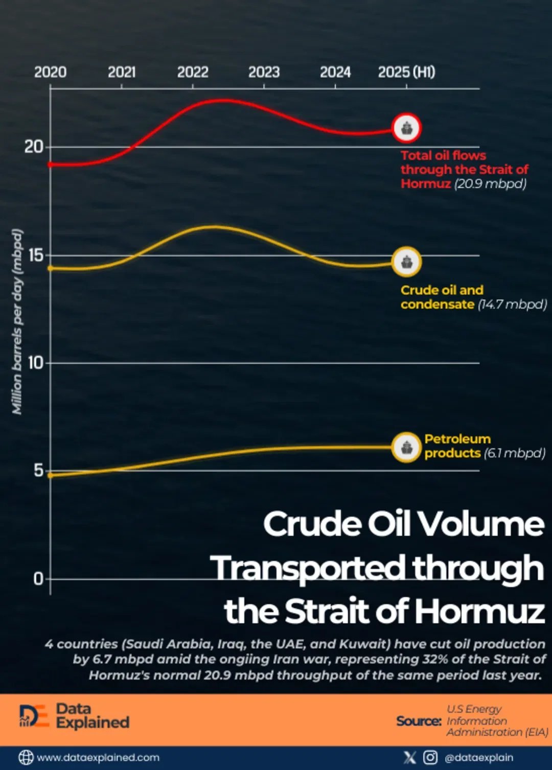 The Strait of Hormuz was moving 20.9 million barrels of oil per day before the war.Saudi Arabia, Iraq, the UAE, and Kuwait have now cut production by 6.7 million barrels per day, 32% of that total, as the strait's effective closure forces storage tanks to fill and output to shrink.For context: the COVID disruption cut 14.2 million barrels daily. This is already worse.