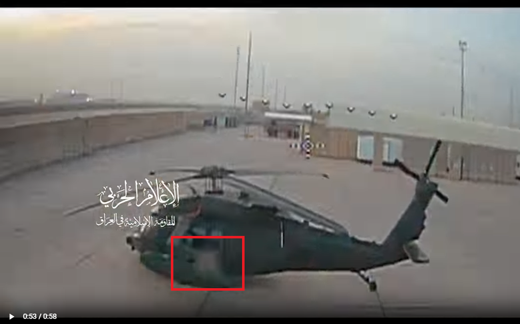 FPV> Islamic Resistance in Iraq releases footage showing fiber optic FPV drone strikes against a “AN/MPQ-64” Sentinel air defense radar and a UH-60M "Black Hawk" helicopter at Victory Camp, Baghdad.