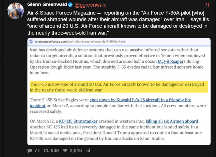 The US lost 20 aircraft against iran so far and one super carrier