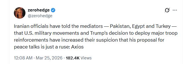Previous >>531567362Timeline:▶ Day 25>The Popular Mobilization Forces in Iraq release video of their FPV drones hitting an AN/MPQ-64 Sentinel radar and UH-60M Blackhawk at Camp Victory (Iraq), seemingly unopposed >Confirmed strikes on Kuwait International Airport including fuel storage tanks>Iran continues drone and missile attacks on Israel & US bases and GCC countries>Iran's military dismisses Trump's claim of talks▶ Day 24>Trump says Iran delivered major oil and gas “present” as talks progress>Iranian ballistic missile impacts just off the shore of Beirut>NYT: Saudi crown prince urges Trump to continue war on Iran to reshape the Middle East(now denied on al arabiya publicly)>Katz: The IDF will control the security buffer zone up to the Litani>Tit for tat exchange begins after Israel strikes Iranian energy infrastructure▶Livestreamshttps://www.youtube.com/watch?v=4E-iFtUM2kkhttps://www.youtube.com/watch?v=TdcrT5OcS9chttps://www.youtube.com/watch?v=53G-Oy4r6M4▶Telegramhttps://rentry.org/tgnews▶Twitter accountshttps://nitter.net/clashreporthttps://nitter.net/FaytuksNetworkhttps://nitter.net/sentdefender▶Israel Rocket Alertshttps://www.tzevaadom.co.il/en/▶Air Traffichttps://www.flightradar24.com/https://flightaware.com/livehttps://globe.adsbexchange.com▶Maritime Traffichttps://www.marinetraffic.com/https://www.vesselfinder.com/