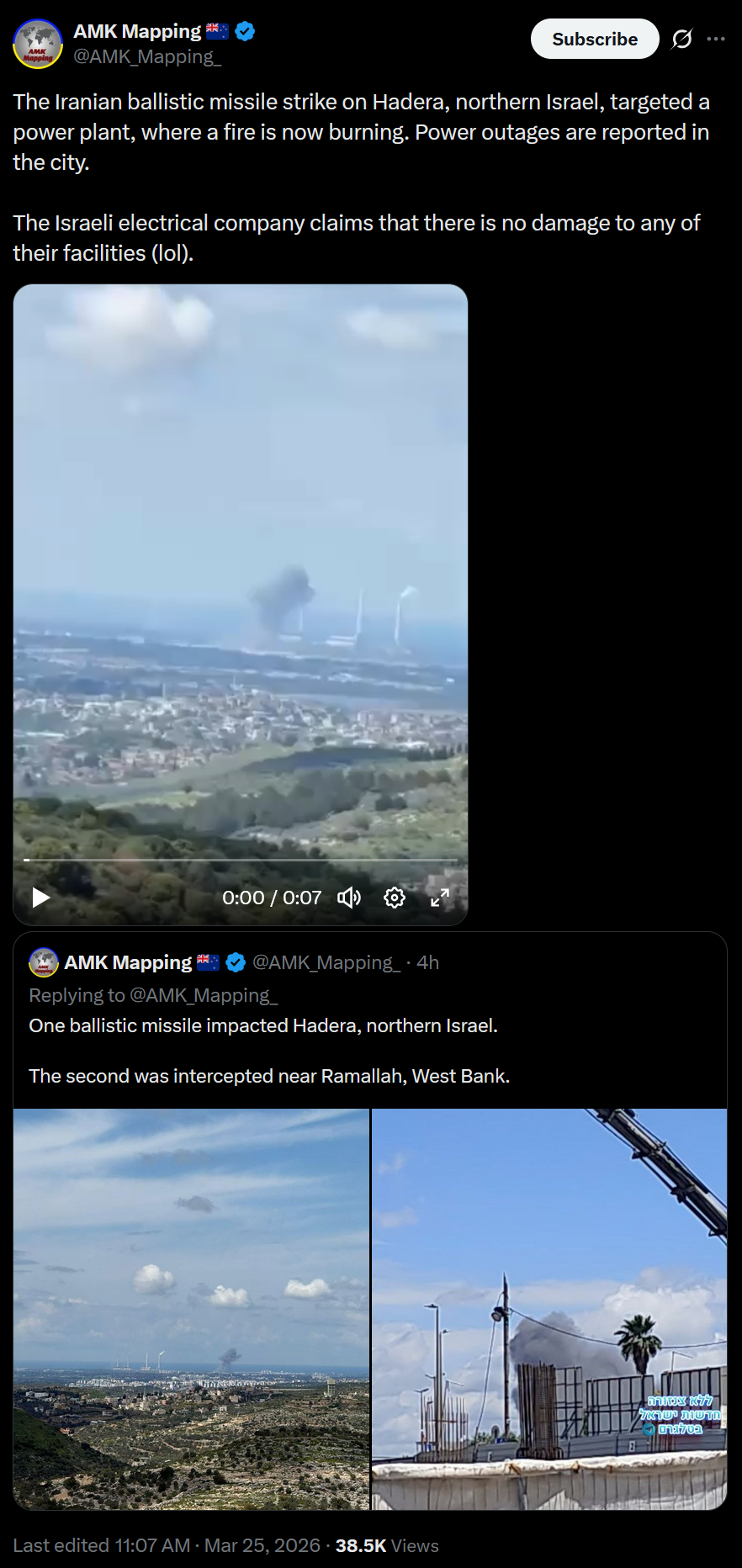 >The Iranian ballistic missile strike on Hadera, northern Israel, targeted a power plant, where a fire is now burning. Power outages are reported in the city.>The Israeli electrical company claims that there is no damage to any of their facilities (lol).damn terror bombers