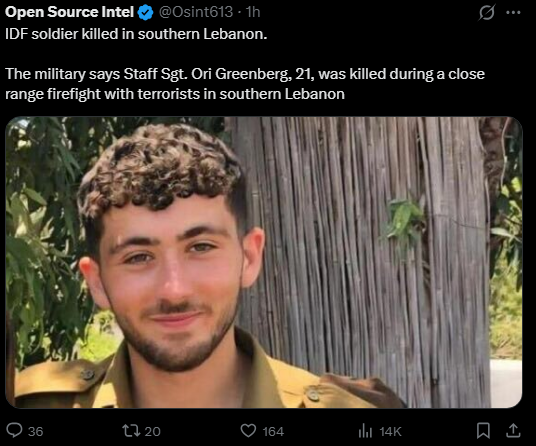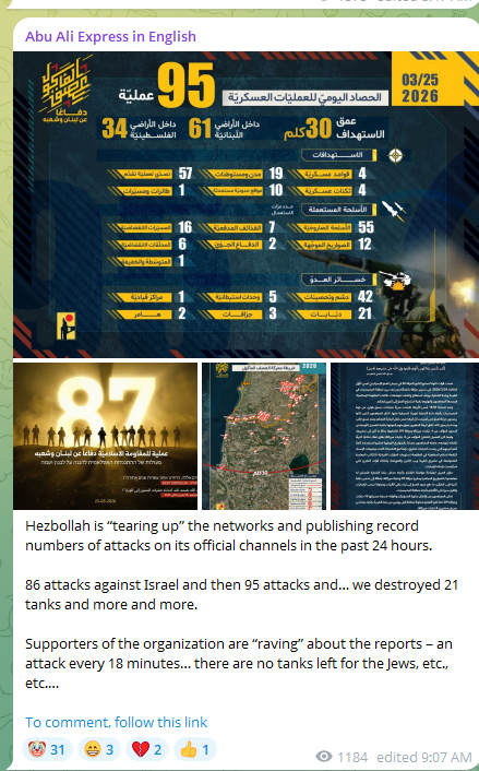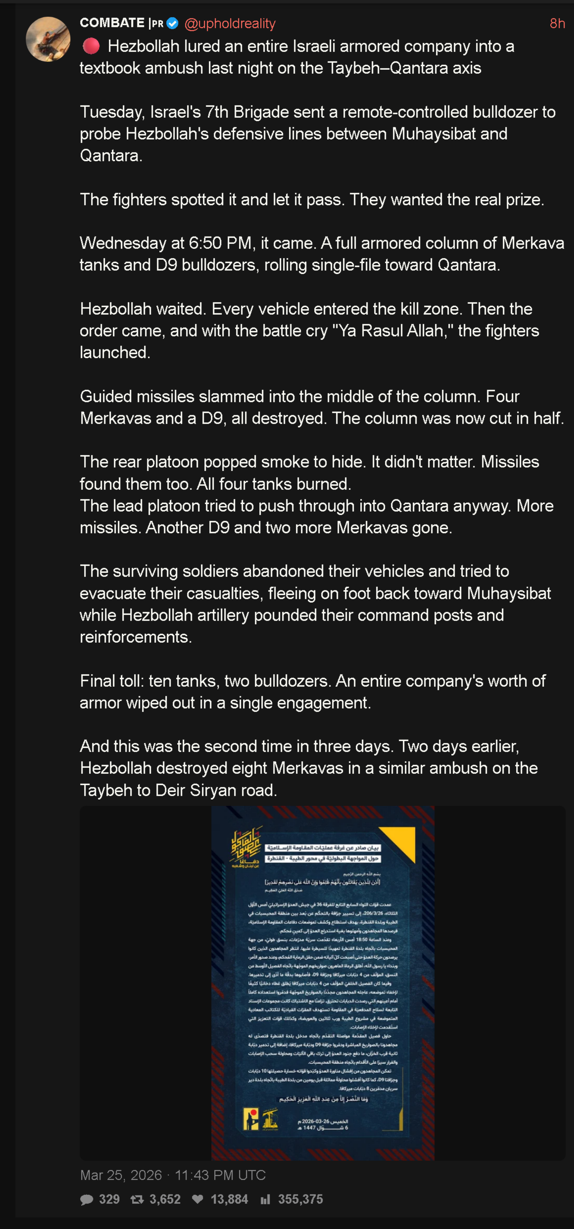 >hezbollah destroyed 21 tanksyou know how we knew that Hamas destroyed tanks back in the Gaza war? There we're multiple signs:First there were the obvious videos - i'm not talking about just rpg shots at tanks which could've just trigger the trophy system and got the whole meme of "cutting the video right after the shot". Im talking about the famous videos of them putting charges on the tank itself, IED detonations and sometimes even videos of immobile Merkavas with smoke coming out of them.Furthermore there were also IDF death notices, which would tell that, for example, in a single day a group of around three or four soldiers died in the armored corps, which makes it obvious that they died in a tank. There were also famous stories being reported of people dying in tanks as well all reported in Israeli media. Putting all this together when Hezbollah says that they already managed to destroy 21 TANKS in a period of a week and a half without any persuasive videos and thus far without any IDF death notices, it's just makes it seem like they are just making shit up which they always do. It has already been reported by arab sources that IDF controls 8 villages in the south. If Hezbollah's resistance was so effective how is that possible?