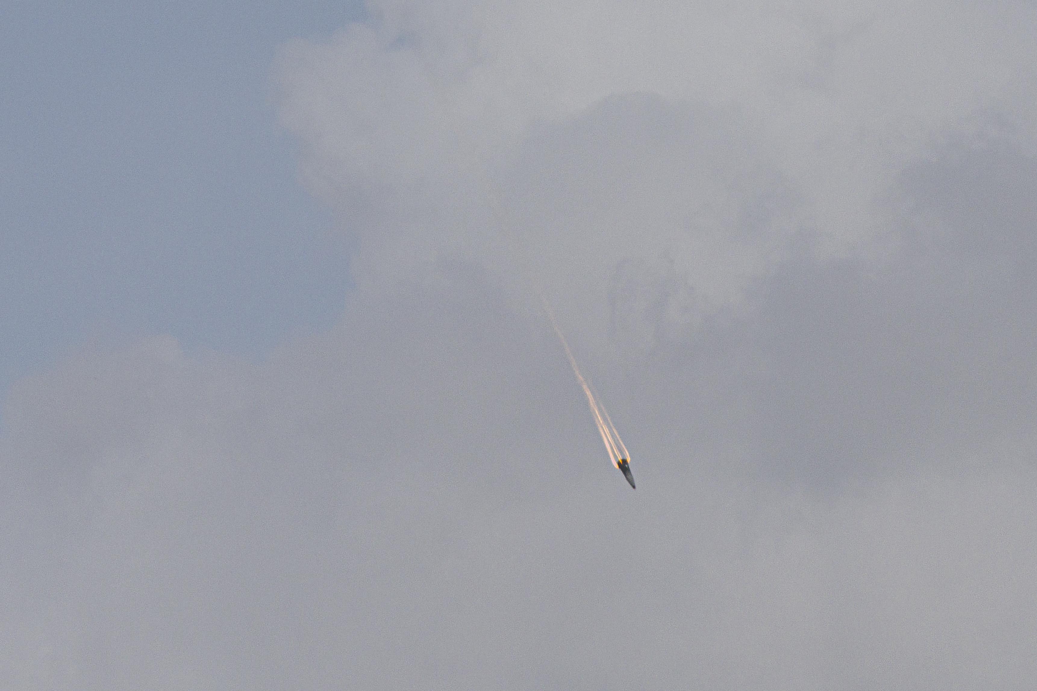 clear view of Iranian air defence missile exploding near tail of F-18video with audio at >>>/wsg/6116687also archived at https://files.catbox.moe/8ozmzi.MP4