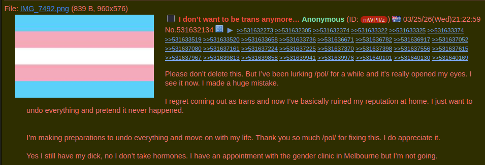 this is uplifting, 4chan saving lives!i wish this for all of our /ptg/ tranny shillsthe key part is>I still have my dickmutilating the dick and/or balls leads to permanent and incurable TDS because all you can do is dilate from there on out. but if you still have your penis and scrotum it's possible to recover and lead a fulfilling life.