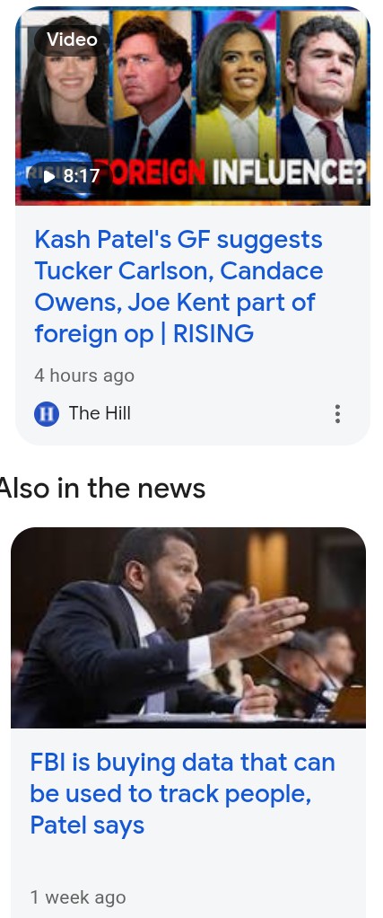 >>531680512In the original, Mulder is an Oxford-educated FBI Special Agent, a conspiracy theorist who believes in a government conspiracy to hide the truth In the real world, Trump Inc 's FBI is run by Kashyap Pramod Patel, the primary author of the Nunes memo, alleging that Federal Bureau of Investigation (FBI) officials abused their authority in the FBI investigation into links between associates of Donald Trump and Russian officials. In April 2022, he was named to the board of Trump Media & Technology Group. He founded The Kash Foundation, a charity to help participants in the January 6 United States Capitol attack pay legal costs. He has promoted conspiracy theories about the deep state, the 2020 presidential election, and the January 6 Capitol attack.