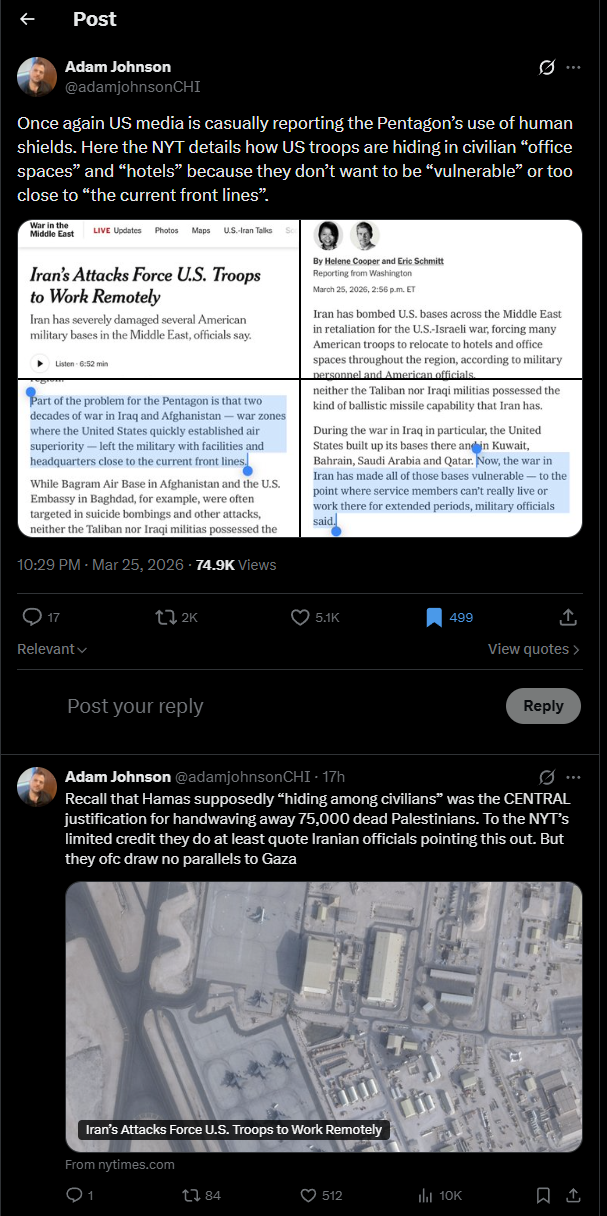>>531683777>Americans hiding behind civilians and in civilian buildings the second they feel threatened by a small scale military powerChecks out