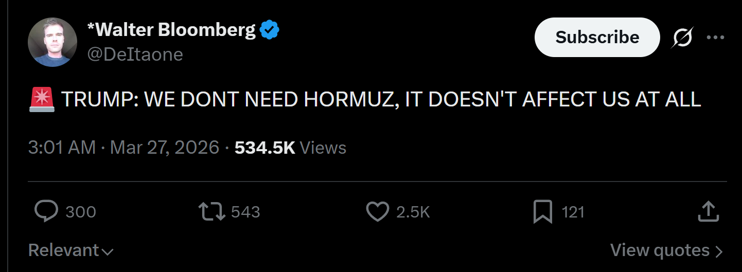 >trump just say he didn't need Hormuz because it doesn't affect the USWhat do now ?