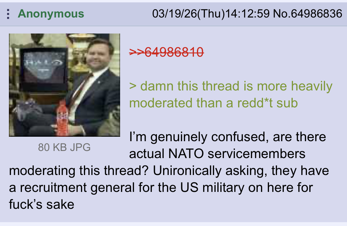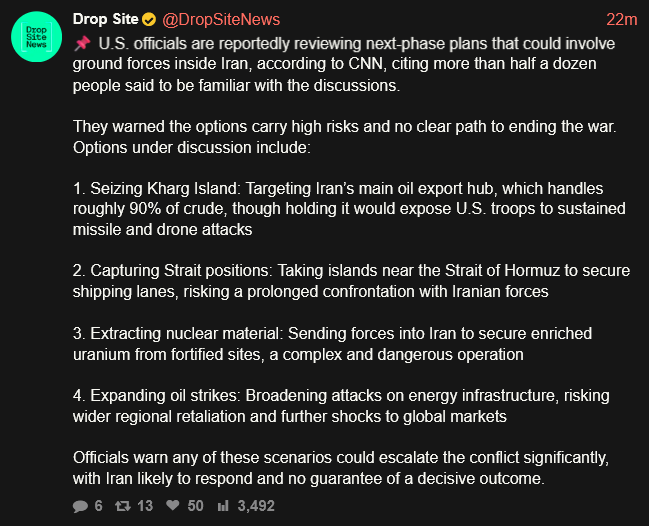 Previous >>531711868Timeline:▶ Day 28>Israeli Chief of Staff: The IDF is on the verge of collapse after 900 straight days of war>France's finance minister announces 30-40% of Gulf energy infrastructure destroyed>The Pentagon is weighing sending up to 10,000 additional troops to the Middle East to give President Trump more military options, according to the Wall Street Journal>Growing suspicion in Israeli security circles: Syria, Turkey, and Iran/Hezbollah may be secretly colluding against Israel>Israeli media reports Al-Jolani's men are assisting Hezbollah at the border crossings today more than the Assad regime▶ Day 27>Wall Street has had its worst day since the war with Iran began, according to the Associated Press.>Benny Shapiro (paraphrased): Americans only got "tired" of Vietnam after 50,000 troops died>Donny extends by 5 days>”final blow” options reportedly considered by trump include taking islands (Kharg, Abu Musa, or Larak), disrupting oil shipments, strikes on nuclear sites, and special ops to seize nuclear material▶ Day 26>US forces staying in hotels as most of its 13 bases in the region are “uninhabitable” - NYT>Trump receives a daily briefing in the form of a 2 minute long highlight reel showcasing USA successes - NBC▶Livestreamshttps://www.youtube.com/watch?v=4E-iFtUM2kkhttps://www.youtube.com/watch?v=TdcrT5OcS9chttps://www.youtube.com/watch?v=53G-Oy4r6M4▶Telegramhttps://rentry.org/tgnews▶Twitter accountshttps://nitter.net/clashreporthttps://nitter.net/FaytuksNetworkhttps://nitter.net/sentdefender▶Israel Rocket Alertshttps://www.tzevaadom.co.il/en/▶Air Traffichttps://www.flightradar24.com/https://flightaware.com/livehttps://globe.adsbexchange.com▶Maritime Traffichttps://www.marinetraffic.com/https://www.vesselfinder.com/▶Kinohttps://files.catbox.moe/jv7tdp.mp4 (embed)EXCLUSIVE FOOTAGE OF MARINES TRAINING FOR THE GROUND INVASION:https://youtu.be/fmzPRZLaOi8?si=Cc4jdmo-TfzBbDm8