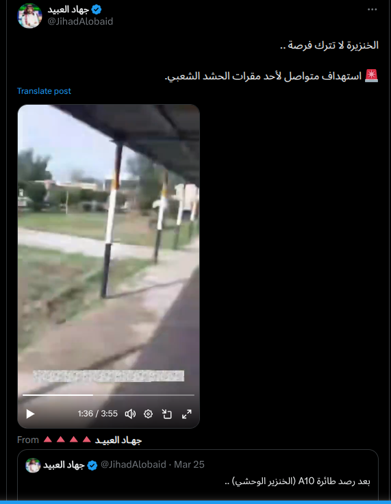 In defense of Lebanon and its people, the Islamic Resistance fighters targeted two "Merkava" tanks in the town of Al-Bayyada with two attack drones at 15:15 and 15:30 on Friday, 27/03/2026, achieving direct hits.