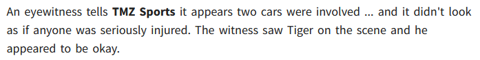 >>531761159TMZ just updated their reporting. Apparently it was a two car collision and Tiger looked uninjured per a witness. Good.