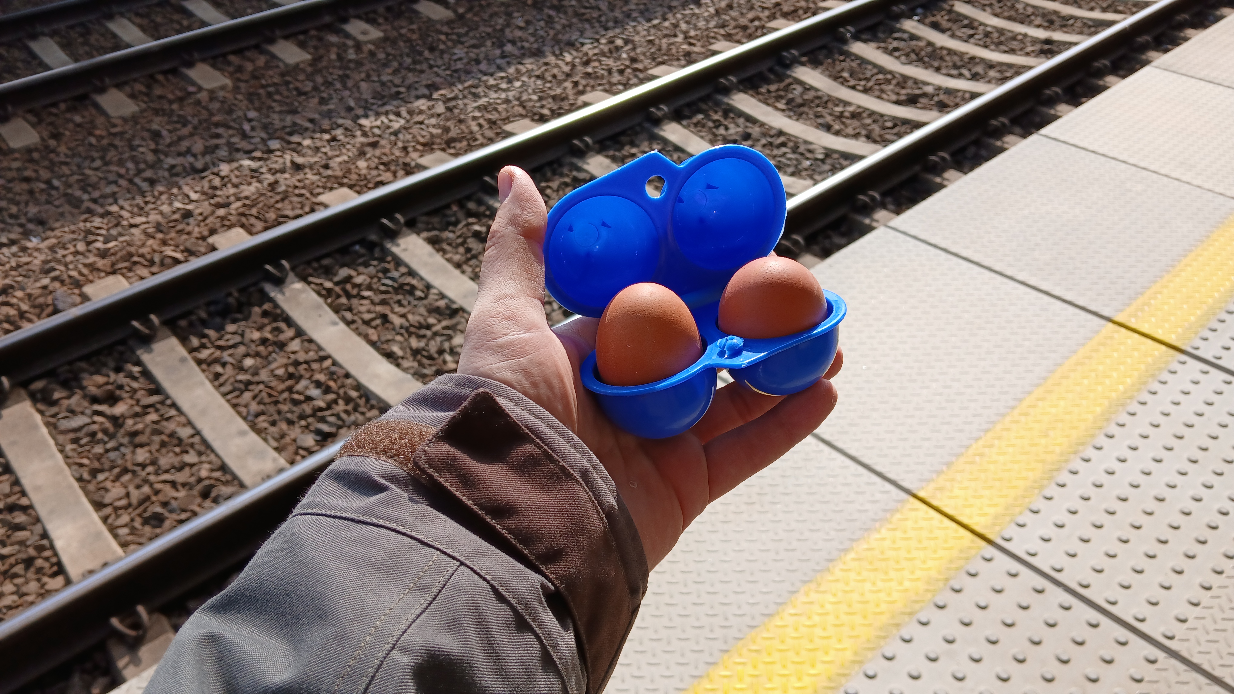 Waiting for my train with my eggs ready for when I get hungry.