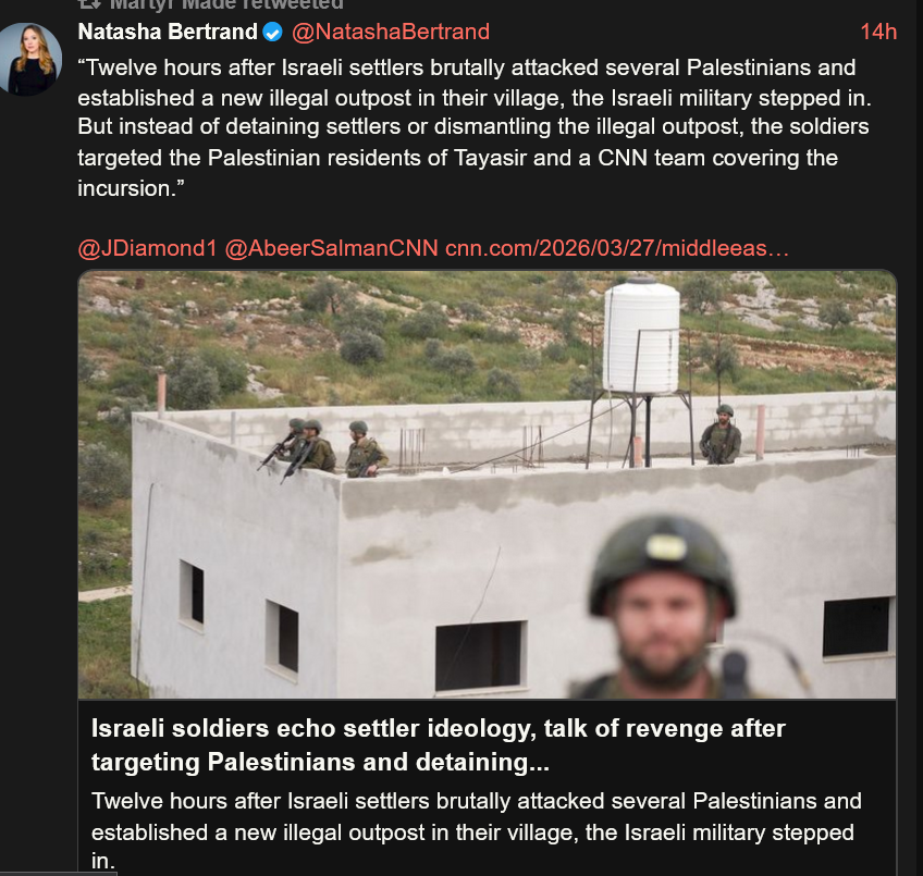 the IDF is now gloating about assassinating journalist on twitter and the american press who whined about kashoggi is silentso much for the free press, if bari weiss is assassinated tomorrow I don't want to hear from anybody that this is somehow terrorismhow can we let our morals be corrupted to this extend. the 5th estate must speak up for their won