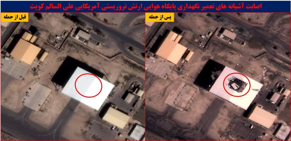 >Other satellite images show a direct strike hitting the Air Force helicopter hangar at Ali Al Salem Air Base, Kuwait